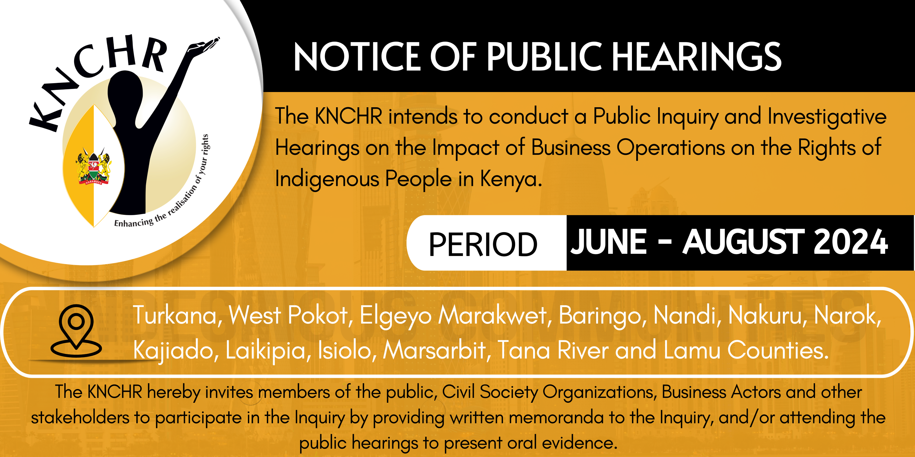 The KNCHR intends to conduct a Public Inquiry and Investigative Hearings on The Impact of Business Operations on the Rights of Indigenous People in Kenya (June – August 2024). The Inquiry targets Turkana, West Pokot, Elgeyo Marakwet, Baringo, Nandi, Nakuru, Narok, Kajiado, Laikipia, Isiolo, Marsarbit, Tana River and Lamu Counties. The KNCHR hereby invites members of the public, Civil Society Organizations, Business Actors and other stakeholders to participate in the Inquiry by: